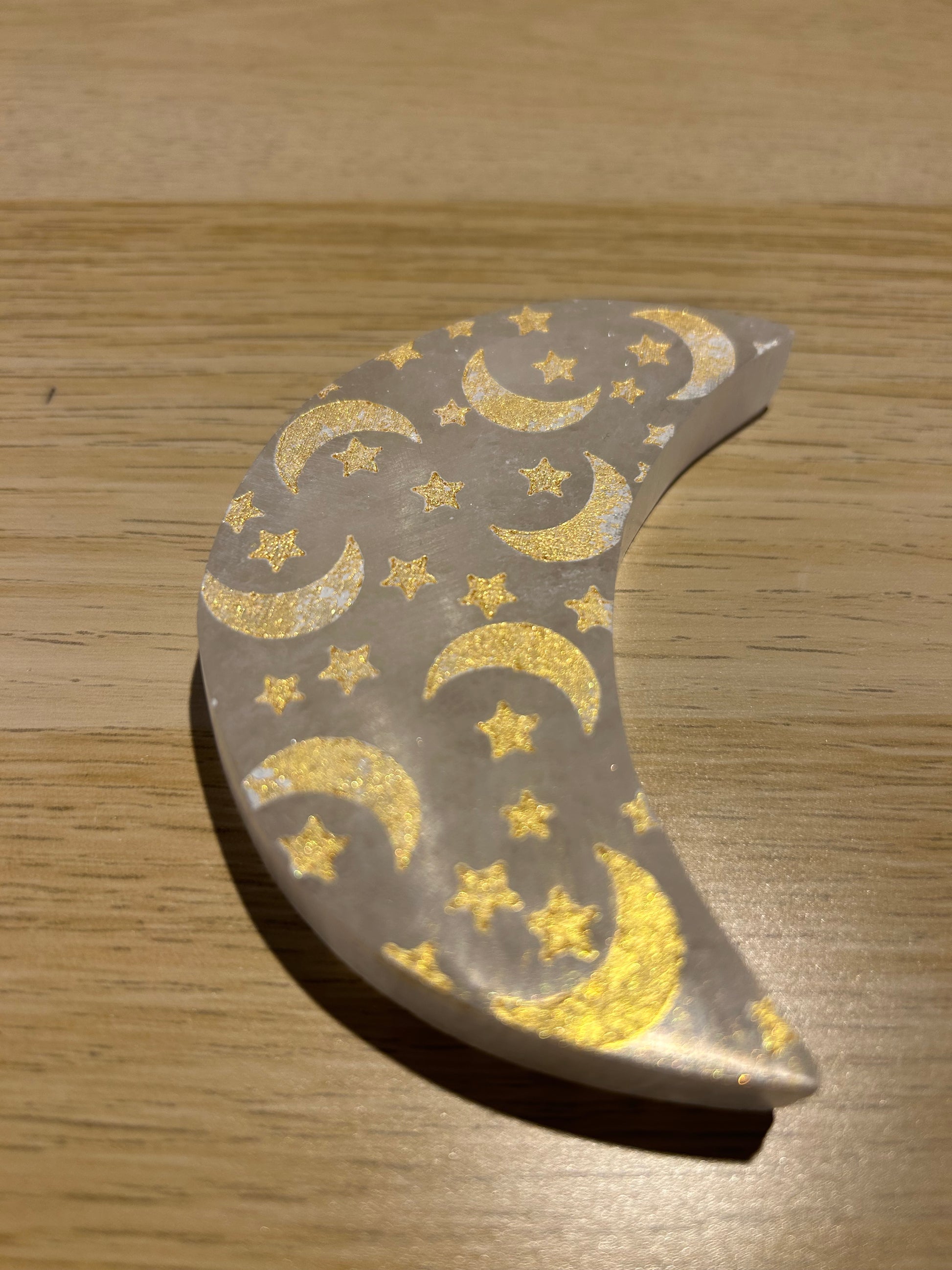 Media Luna labrada patrón lunas y estrellas 10cm de selenita natural